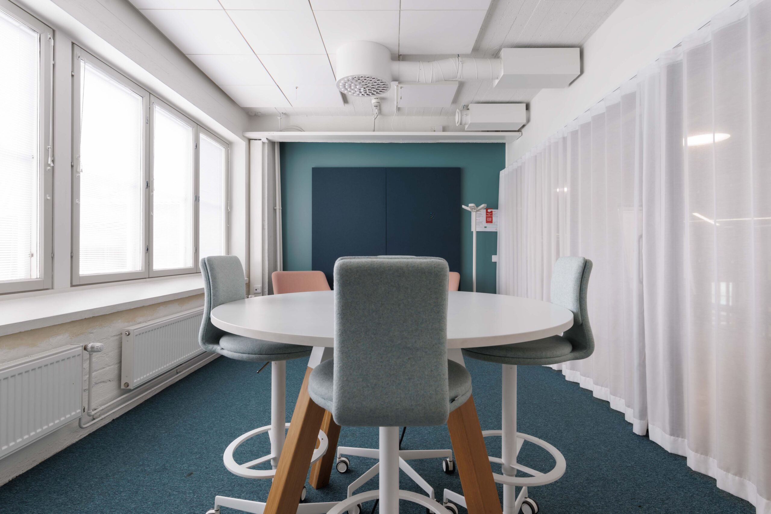 Pieni kokoustila, korkealla pöydällä ja tuoleilla. Tilassa esitysnäyttö